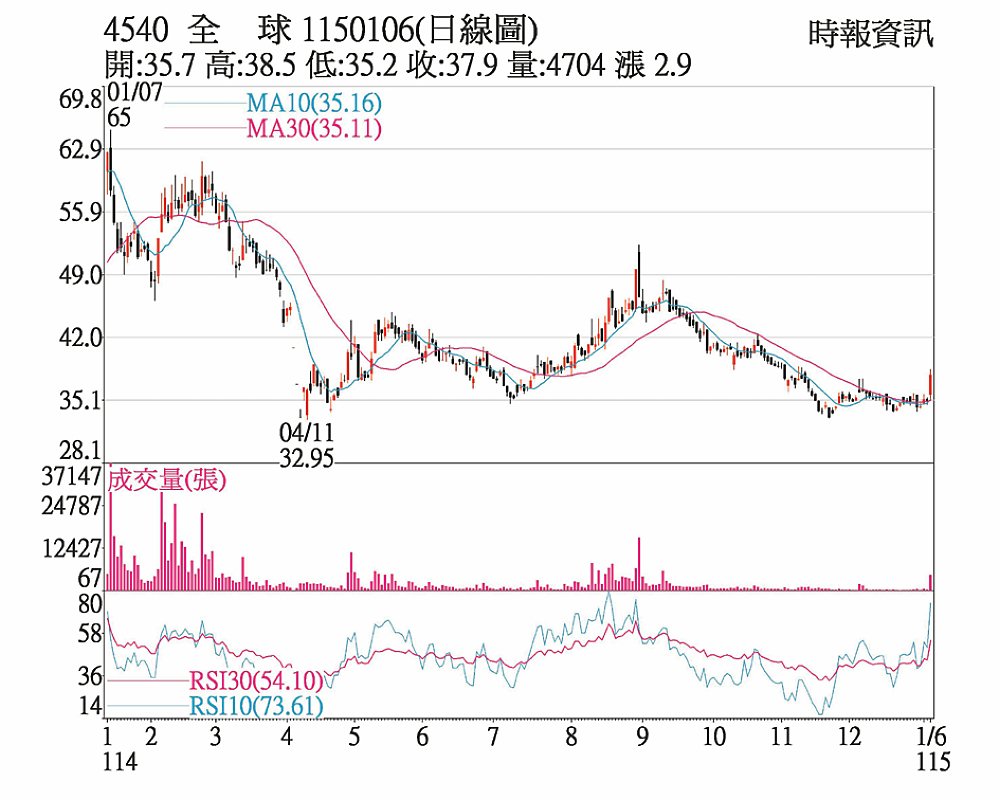 全球傳動(4540)受惠機器人題材,儘管外資已連續二個交易日賣出,6日大砍1,041張,但無損市場追價意願,買盤強勁帶動下,開盤1小時10分鐘即攻上漲停價38.50元,之後隨獲利回吐賣壓湧現,漲停打開拉回,終場上漲2.90元、收37.9元。