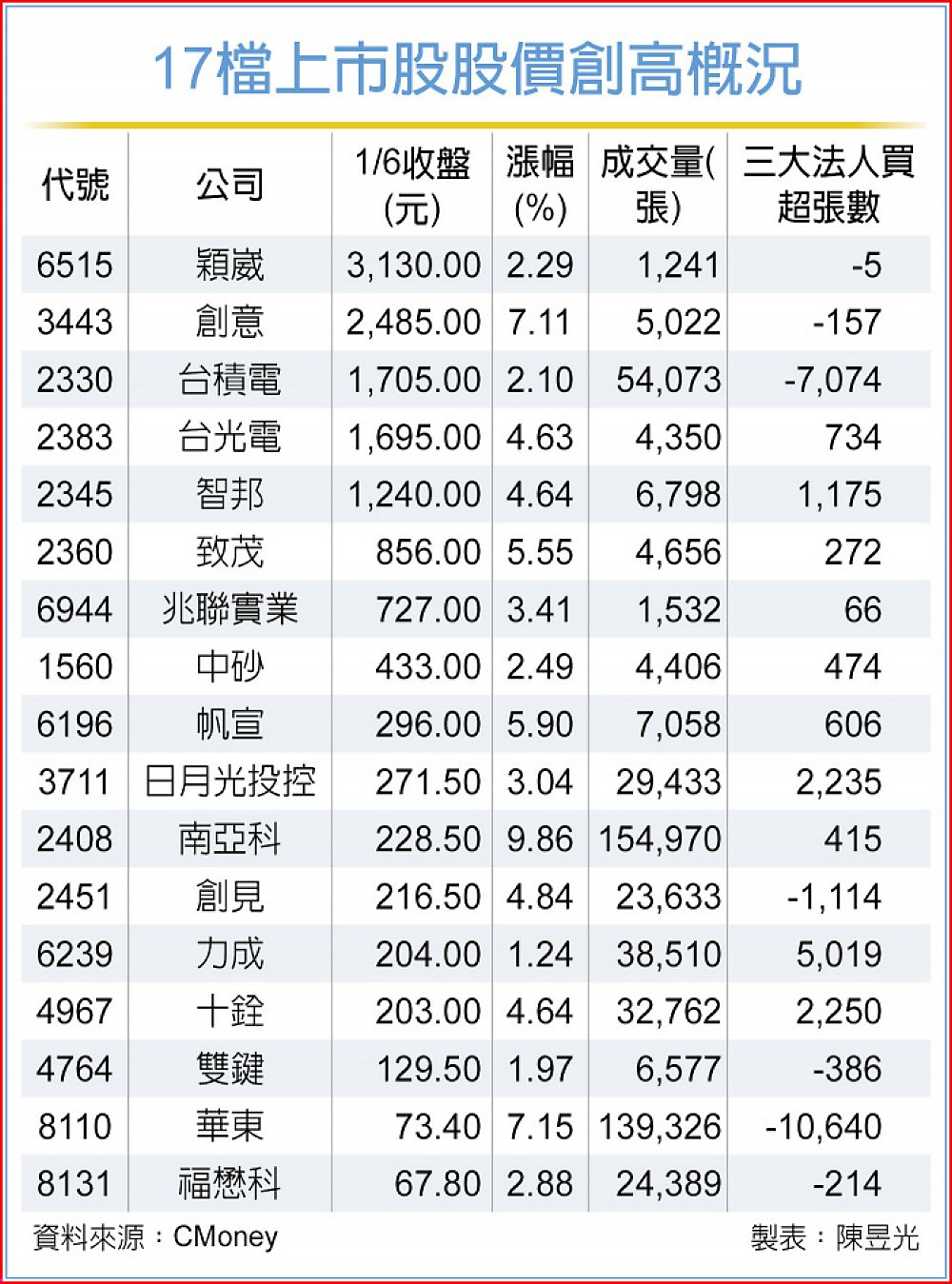 台股多頭氣勢強勁,權王台積電(2330)尾盤上攻,再創新天價1,705元,統計上市個股中,還有穎崴(6515)、創意(3443)等共17檔6日股價同步改寫新高,扮演盤面吸金指標。