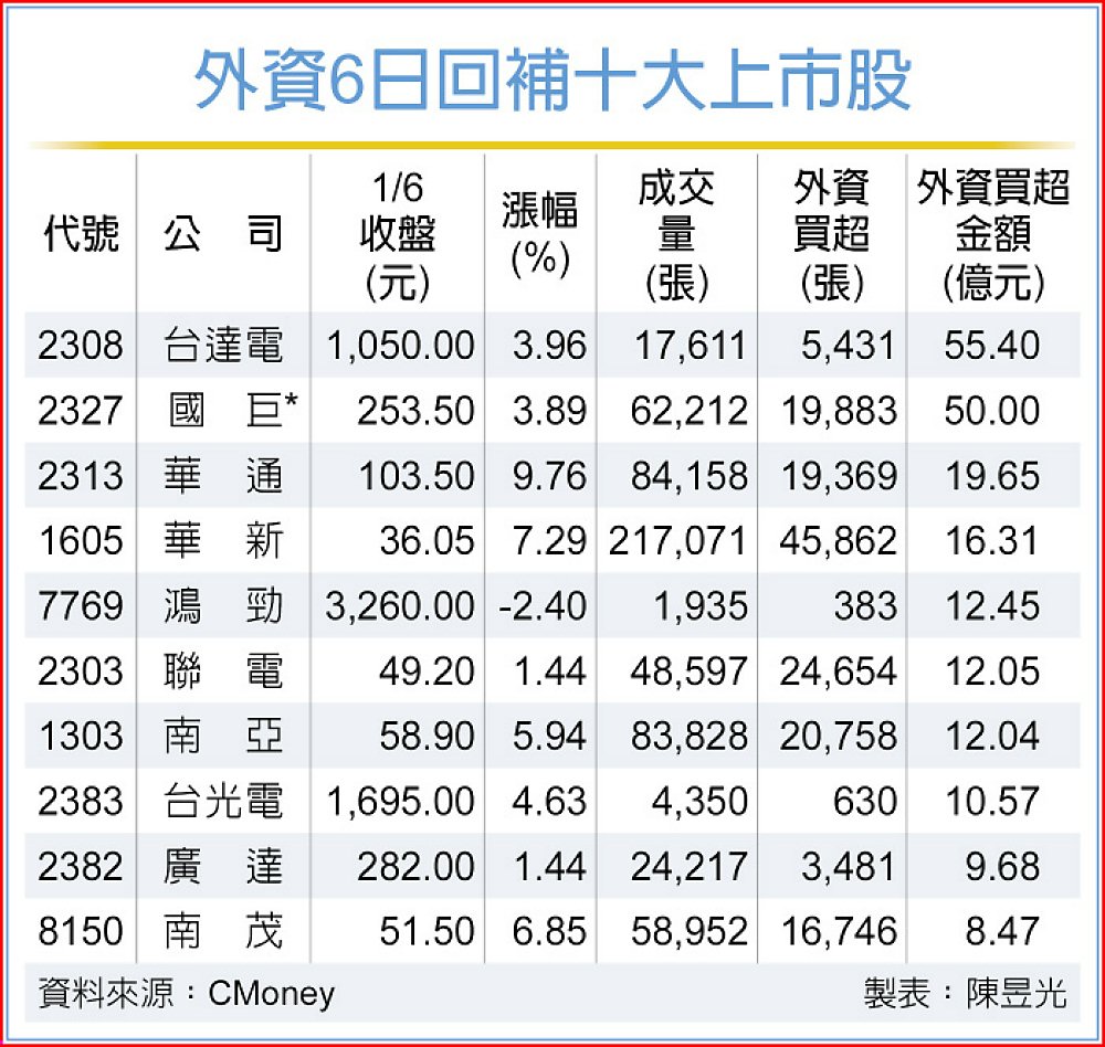 外資6日回補台股28.41億元,投資專家看好,台股「元月效應」暢旺,預料大盤短線還有上攻空間,國際資金回流動能可期,6日主要買超個股包括台達電(2308)、國巨*(2327)、華通(2313)等上市股,帶動股價走揚。