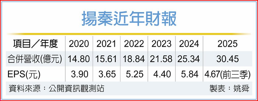 揚秦(2755)受惠兩大加盟引擎「麥味登」與「炸雞大獅」展店效益,與新品牌「涮金鍋」助攻,2025年12月營收2.86億元、年增23.18%,第四季營收8.23億元,年增20.60%、季增4.55%,累計2025全年營收30.45億元、年增20.10%,分別改寫單月、單季、年度營收新高紀錄。