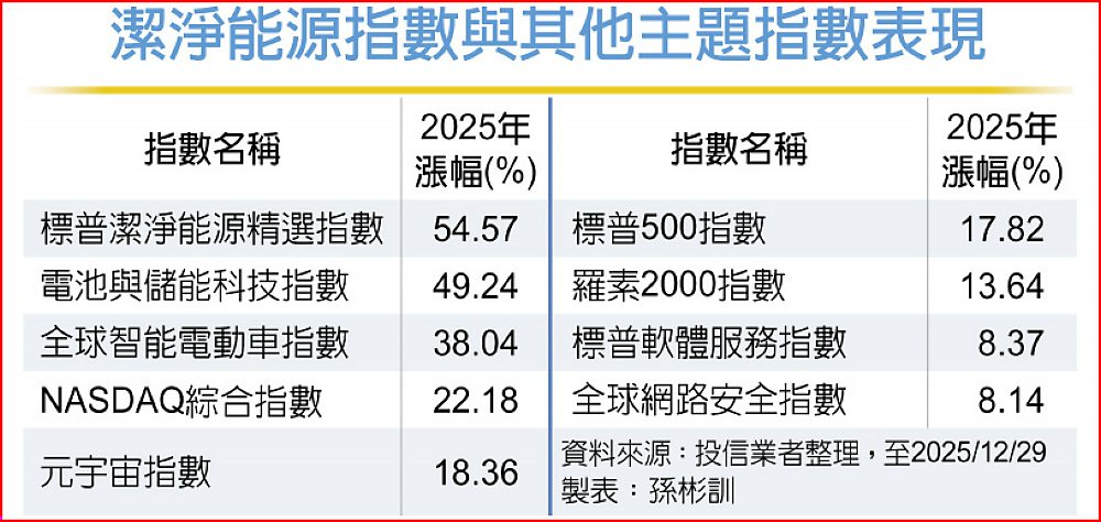 全球潔淨能源產業在政策逆風下,展現驚人韌性。受惠於人工智慧(AI)資料中心龐大的電力需求,標普潔淨能源精選指數2025年以來大漲54.57%,不僅遠勝標普500指數17.82%的漲幅,更成為年度最亮眼的投資主題之一,另基礎建設也是重點的投資關注焦點。