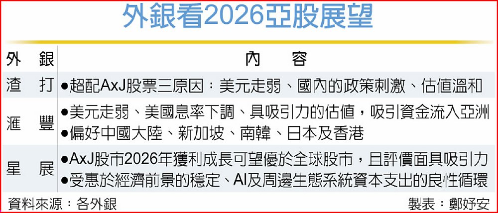 外銀關注亞股前景。星展銀行表示,在北亞科技類股和正面的經濟情勢帶動下,2025年新興亞股強勁走升,新興亞股2026年獲利成長可望優於全球股市,且評價面依然具吸引力。大陸、台灣和南韓的EPS可望有雙位數的成長率,而受惠於經濟前景的穩定、AI及周邊生態系統資本支出的良性循環,2026年前景亮麗。