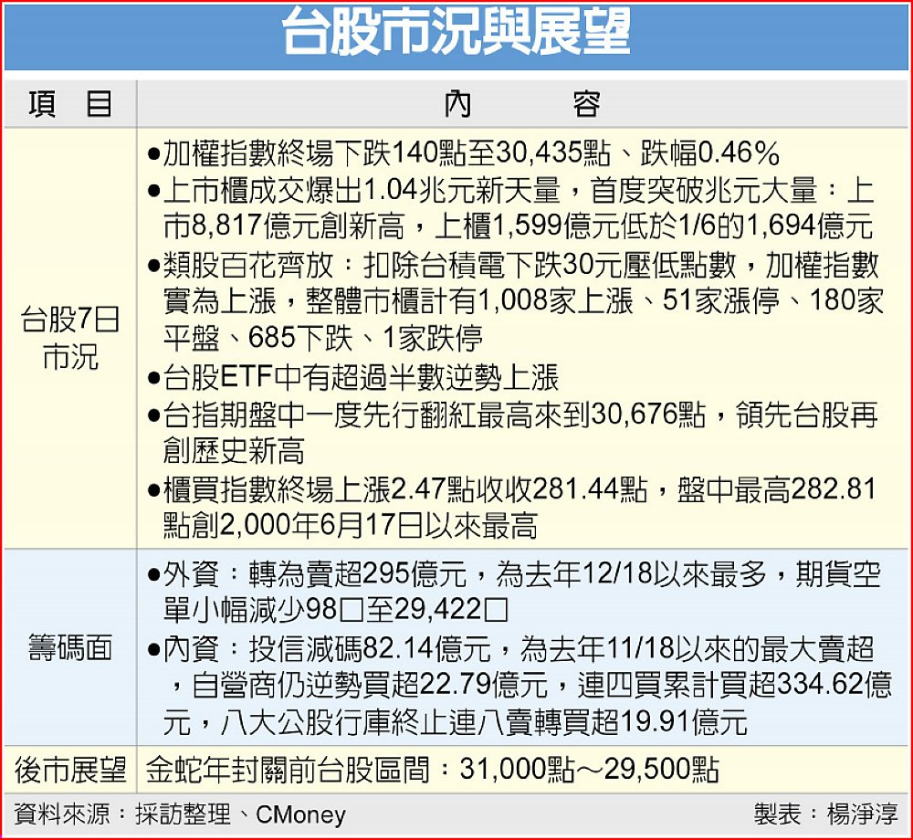 台股加權指數連四日創高後,7日遭遇外資擴大獲利了結賣超台積電達448億元,加上隔日沖跟著賣出,加權指數盤中一度下跌270點,隨即見到低接買盤湧進、一度拉升僅小跌6點,終場空方略勝一籌,指數下跌140點收30,435點,寫十字紅K,成交量則在換手量與當沖量大增下,集中市場擴增至8,817億元新高,市櫃合計首度突破1兆元至1.04兆元,寫下歷史最大量。