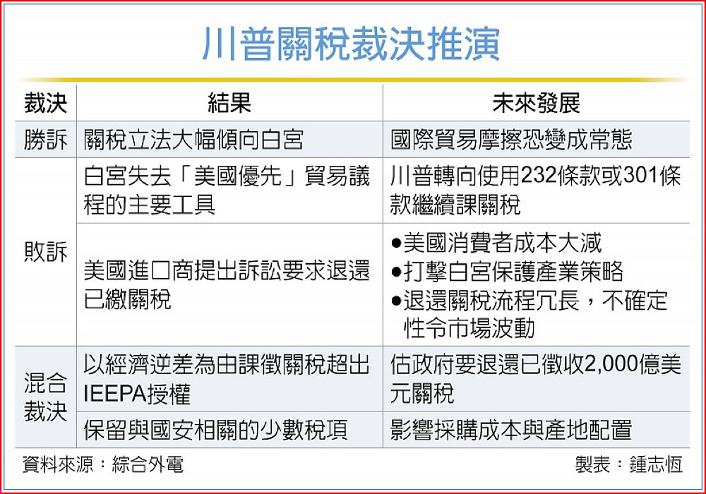 外界認為結果之一的全面勝訴,即川普根據「國際緊急經濟權力法」(IEEPA)向各國課徵對等關稅,和以「國家安全」為由對特定進口品課關稅等全屬合法,等同強化總統徵收關稅權力。