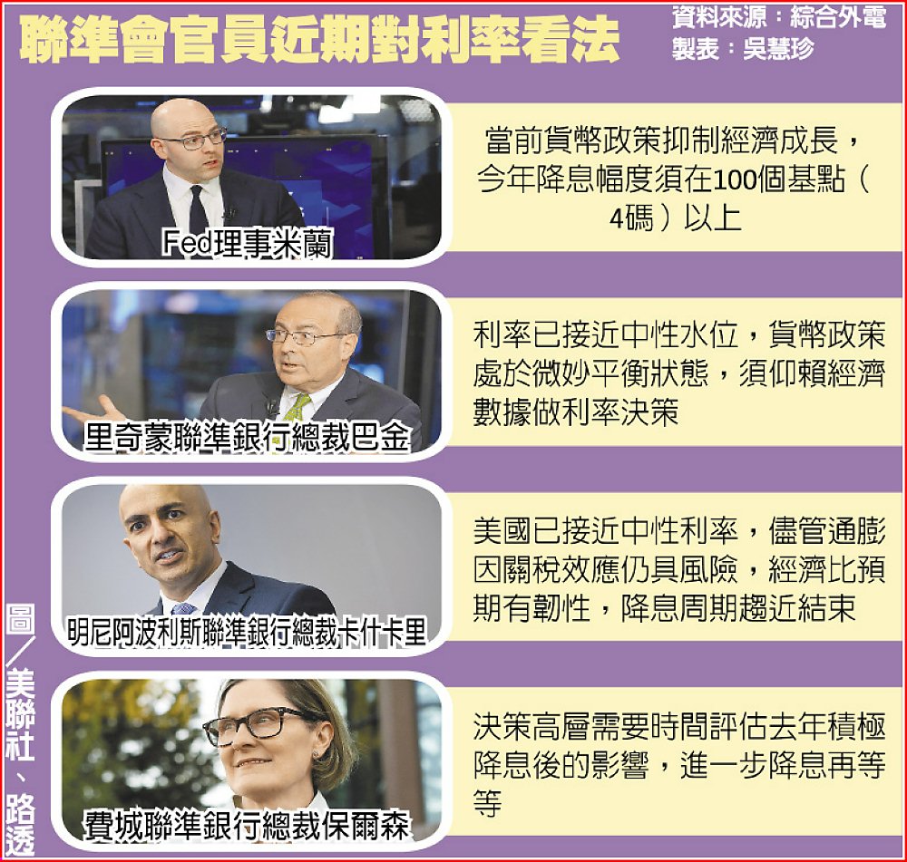 Fed去年12月例會連續第三度降息,利率水位降至3.5%到3.75%區間,但也暗示短期內未必進一步降息。據上月發布的最新利率點陣圖,決策官員對通膨與就業市場前景看法分歧,中位數預估顯示今年僅降息1碼,與米蘭去年幾次例會主張降息2碼大相逕庭。