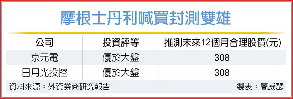 封測雙雄日月光投控、京元電子股價近期雙雙寫下歷史新高,外資再度上調財務預期。摩根士丹利證券指出,AI半導體需求強勁,雙強訂單能見度佳,日月光投控封測代工服務漲價幅度可望達到5%~20%,同步將二檔封測領域指標股推測合理股價都升至308元,開啟攜手奔赴3字頭行情。
