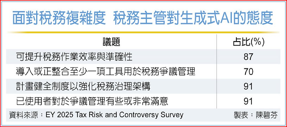 調查指出,87%受訪者認為,AI可有效提升稅務作業效率與準確性,70%企業已導入、或正在整合GenAI工具用於稅務爭議管理。此外,91%受訪者規劃進一步強化稅務治理架構,顯示健全制度已成為企業因應不確定環境的核心策略。