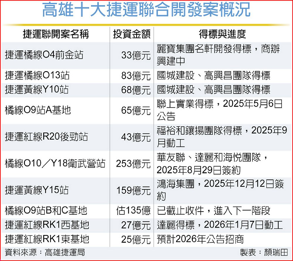總開發金額近900億元的高雄十大捷運聯開案,除興建中、已公告最優申請人、簽約、動工的8案,橘線O9站B和C基地等2案,招商已截止投標,捷運紅線RK1東基地則預定2026年公告招商。