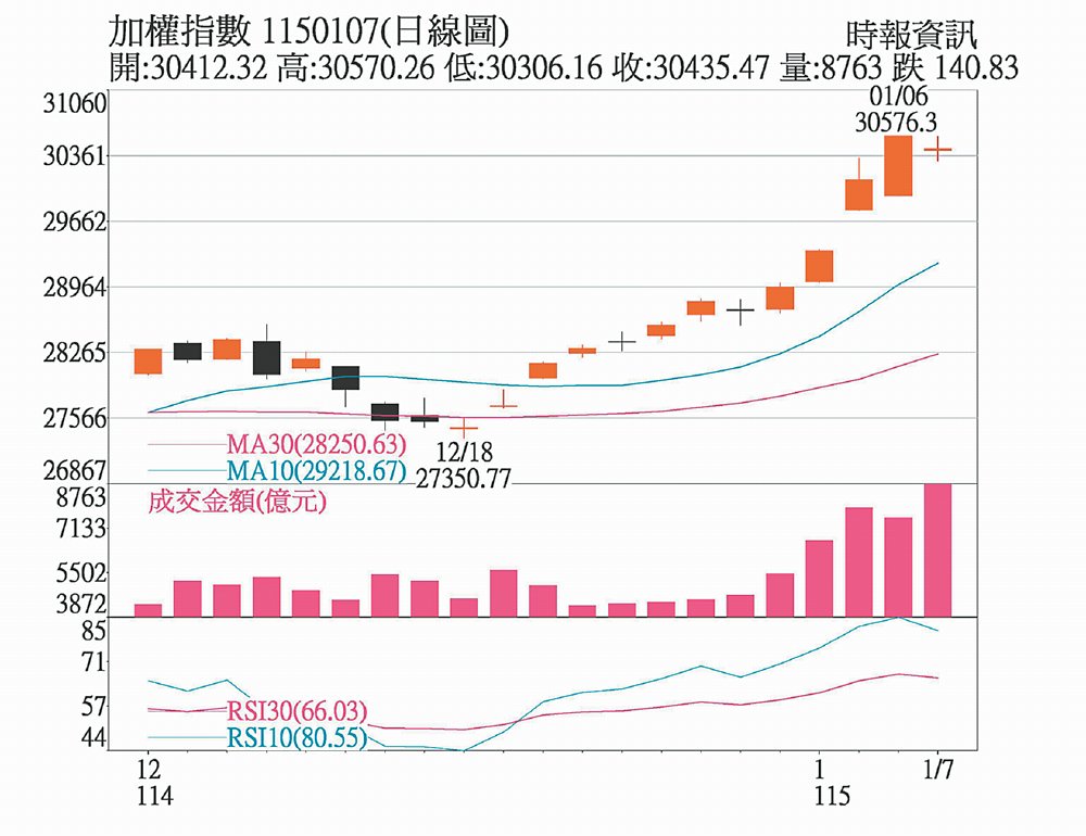 操盤建議:7日台股加權指數下跌140點收30,435點,目前台股多方格局強勢,但在連續大漲創高後,技術指標鈍化,指數和月線的乖離率亦加速擴大,波動放大在所難免,需提防短線技術性拉回。15日的台積電法說會,關注焦點包括2奈米量產進度、資本支出及後市展望等;此外,本月下旬的美國重要科技股陸續公布的財報,則是市場關注的另一重點。
