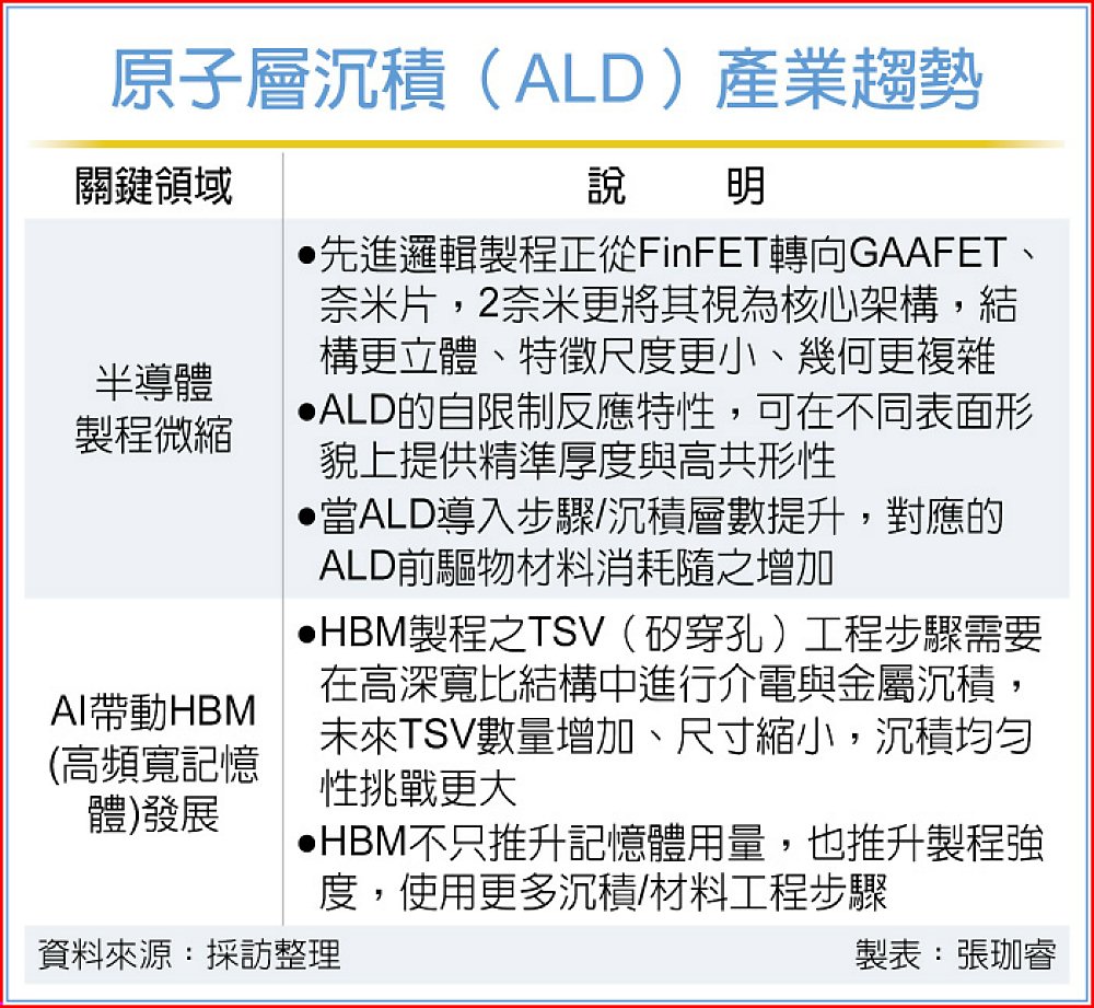從產業趨勢來看,AI伺服器快速成長推升HBM與先進封裝需求,TSV(矽穿孔)製程中,高深寬比結構對介電與金屬沉積均勻性要求更高,使ALD在記憶體與先進封裝領域的應用擴大,對前驅物材料形成長期利多。