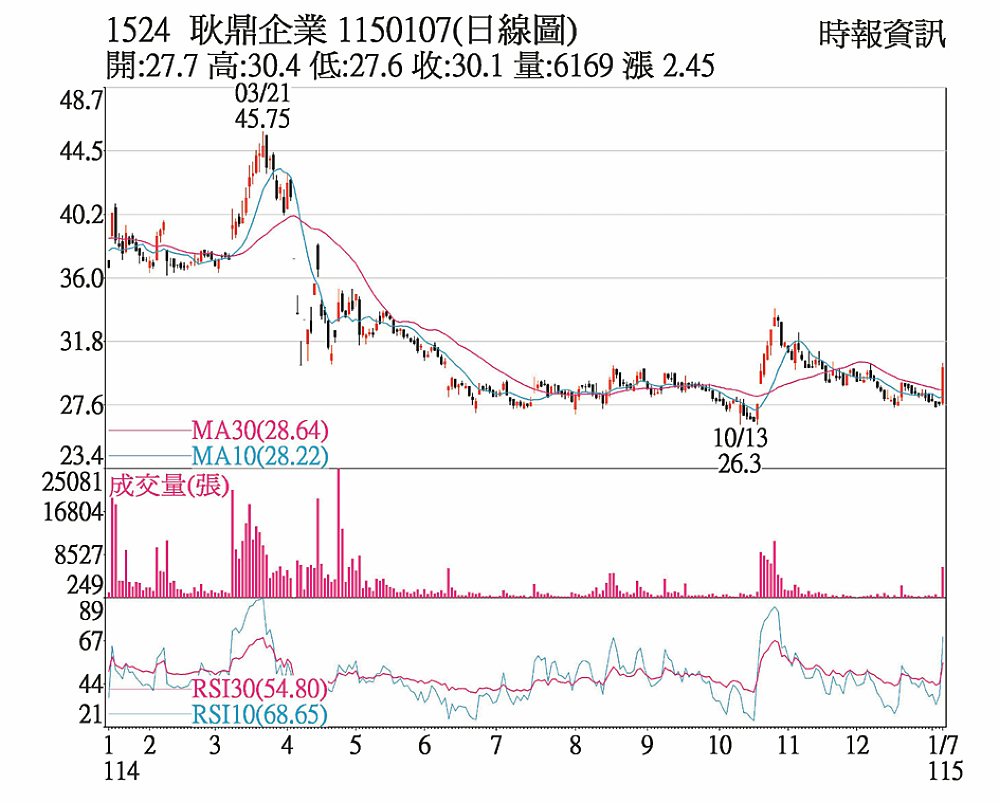 耿鼎(1524)7日股價於盤中急拉一度亮燈漲停,不過隨即打開,終場收30.1元、漲幅8.86%,收復短中長期均線,KD翻多並呈現黃金交叉,成交量放大至6,137張,若量能不墜有助股價續揚。