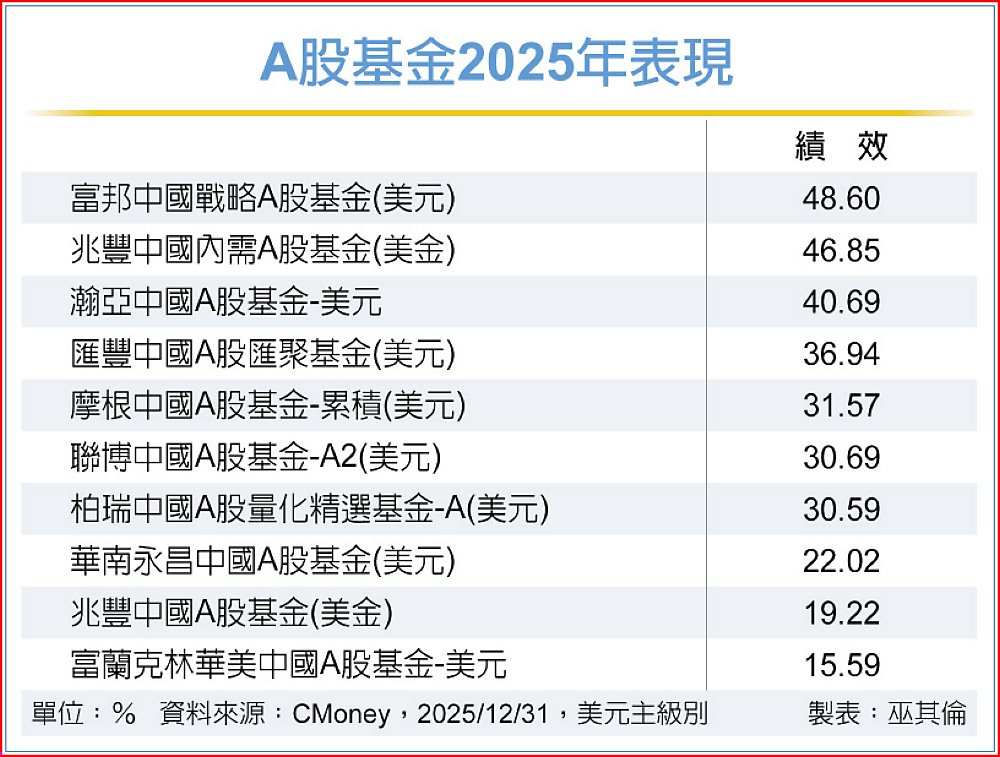 從基金表現來看,A股相關基金2025年以來美元級別績效亮眼,前三名報酬率皆突破40%,富邦中國戰略A股基金48.6%居冠,其次為兆豐中國內需A股基金46.85%,及瀚亞中國A股基金40.69%,顯示在市場回升過程中,聚焦大陸核心成長動能的投資策略,已率先反映在績效表現上。展望2026年,法人預期,市場交易結構將持續改善,宏觀流動性有望維持合理寬鬆,搭配政策預期與資金博弈升溫,春季行情可能提早展開,為布局大陸市場提供相對有利時點。