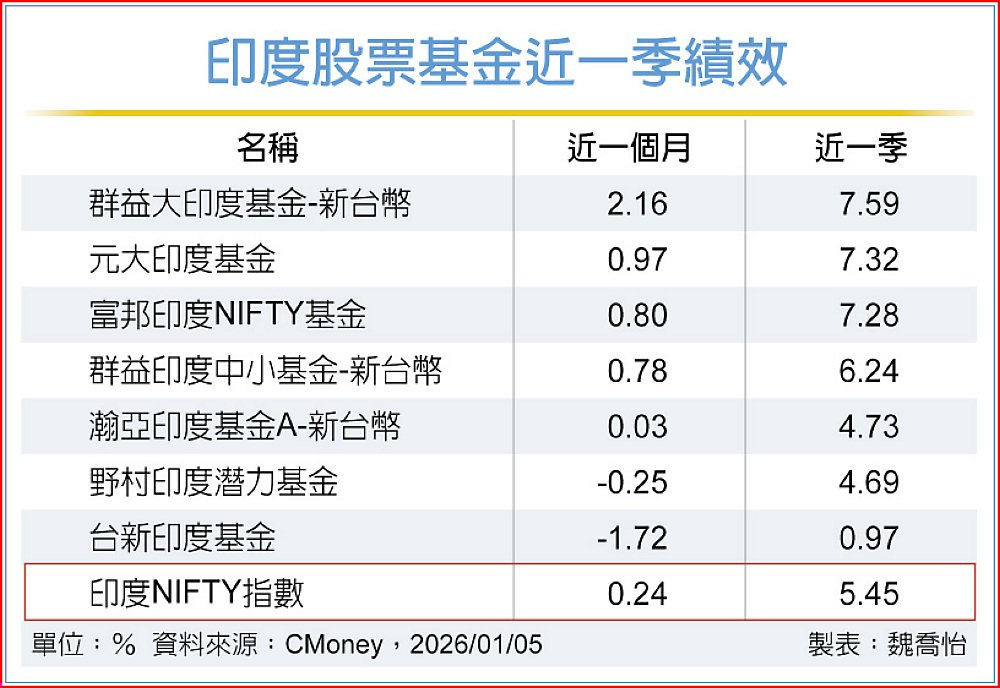 2026年一開年,印度Nifty指數即改寫歷史新高,為新年帶來新氣象。隨著股市報喜,印度股票基金表現也隨之走高。法人觀察投信發行之印度股票基金近一季績效,表現一片紅通通,其中以群益印度上漲7.59%,表現最亮眼。其中,在7檔印度股票基金中,群益大印度、群益印度中小兩檔基金分別在近一週、近一月、近一季表現皆打敗大盤,漲勢最凌厲。