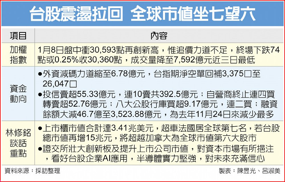台積電帶著台股急漲,近兩日陷入修正,林修銘出席證交所新春記者會時表示,新年開盤以來屢創新高,目前上市櫃市值合計已達3.41兆美元,正式超車法國成為第七名,預估只要再衝高15兆元,就可超越加拿大,成全球市值第六大股市。