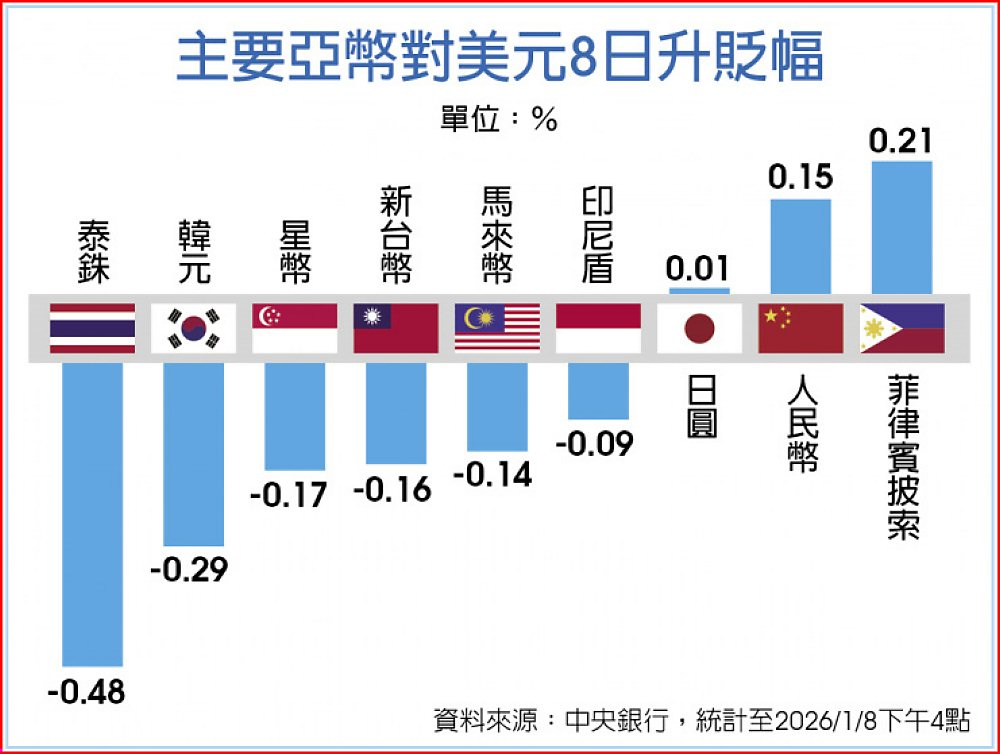隨美元回穩,主要亞幣8日貶多於升,泰銖重挫0.48%最弱、其次為韓元大跌0.29%、星幣貶值0.17%、新台幣貶值0.16%居中、馬來幣貶值0.14%、印尼盾貶值0.09%;逆勢升值有日圓小升0.01%、人民幣升值0.15%。