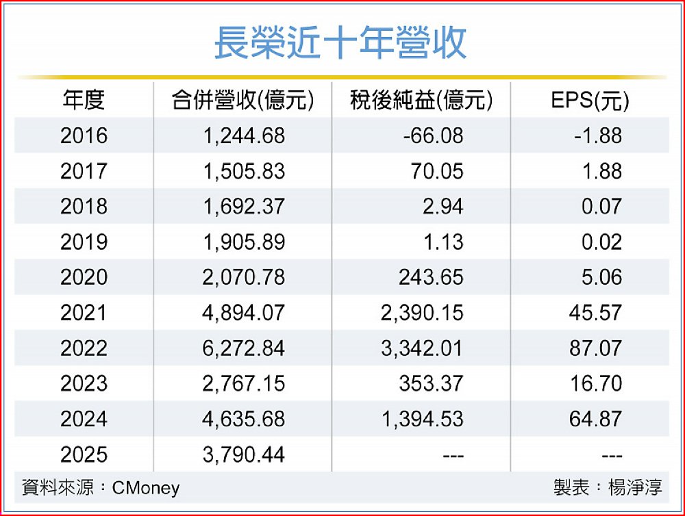 受惠整體運費走揚與農曆年前小旺季加持,長榮海運2025年12月合併營收307.06億元,重返300億元,月增11.12%為連二增、年減19.6%。長榮2025年全年合併營收為3,790.44億元,受前一年度高基期影響,為年減18.23%,但創史上全年第四高紀錄,僅次於2022年的6,272.84億元、2021年4,894.07億元、以及2024年的4,635.68億元。