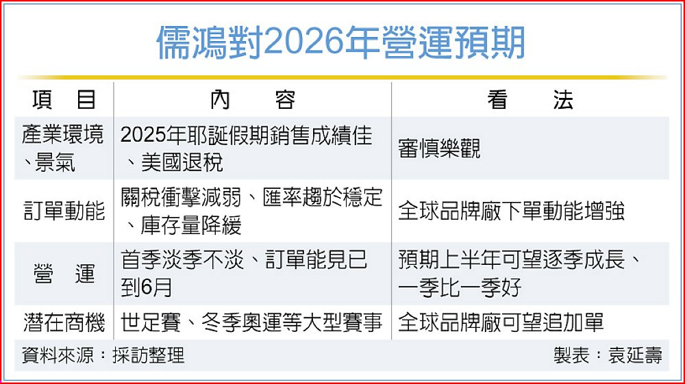 儒鴻預期,2026年上半年訂單能見度清晰,預期營收呈逐季成長、一季比一季強。