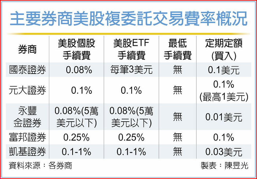 在此波調整下,根據國內前五大券商美股交易費率來看,元大證券及凱基證券美股個股最低牌告手續費約0.1%,富邦證券0.25%,永豐金證券與國泰證券皆為0.08%。