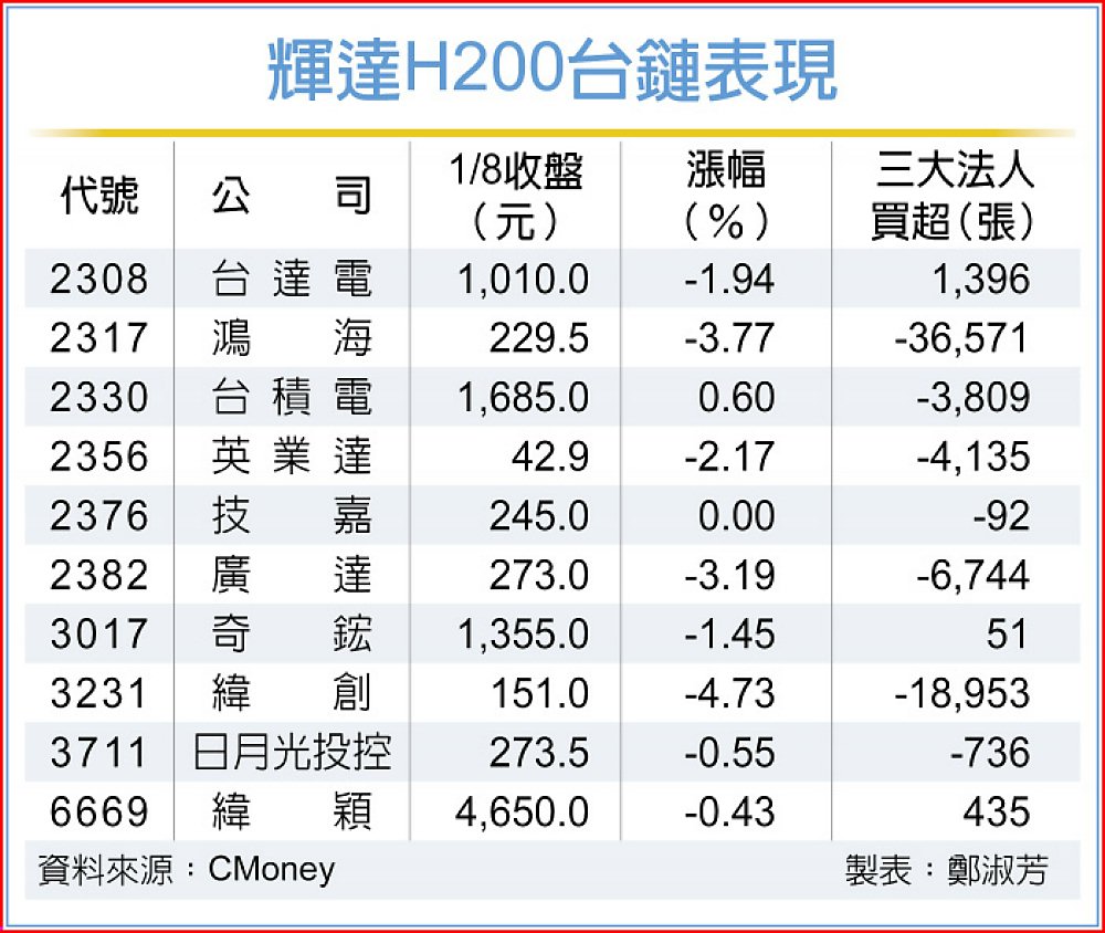 輝達(NVIDIA)執行長黃仁勳前腳才在美國消費性電子展(CES 2026)中對外宣布,輝達已重新啟動H200人工智慧(AI)晶片模組供應鏈,量產出貨在即,沒想到不到一天時間就遭中國官方打臉,傳北京當局要求科技巨頭暫停採購H200晶片,H200概念股包括日月投控(3711)、鴻海(2317)、廣達(2382)、緯創(3231)、緯穎(6669)、英業達(2356)、華碩(2357)、奇鋐(3017)及台達電(2308)全面收黑,由狂喜到狂悲只在一瞬間。
