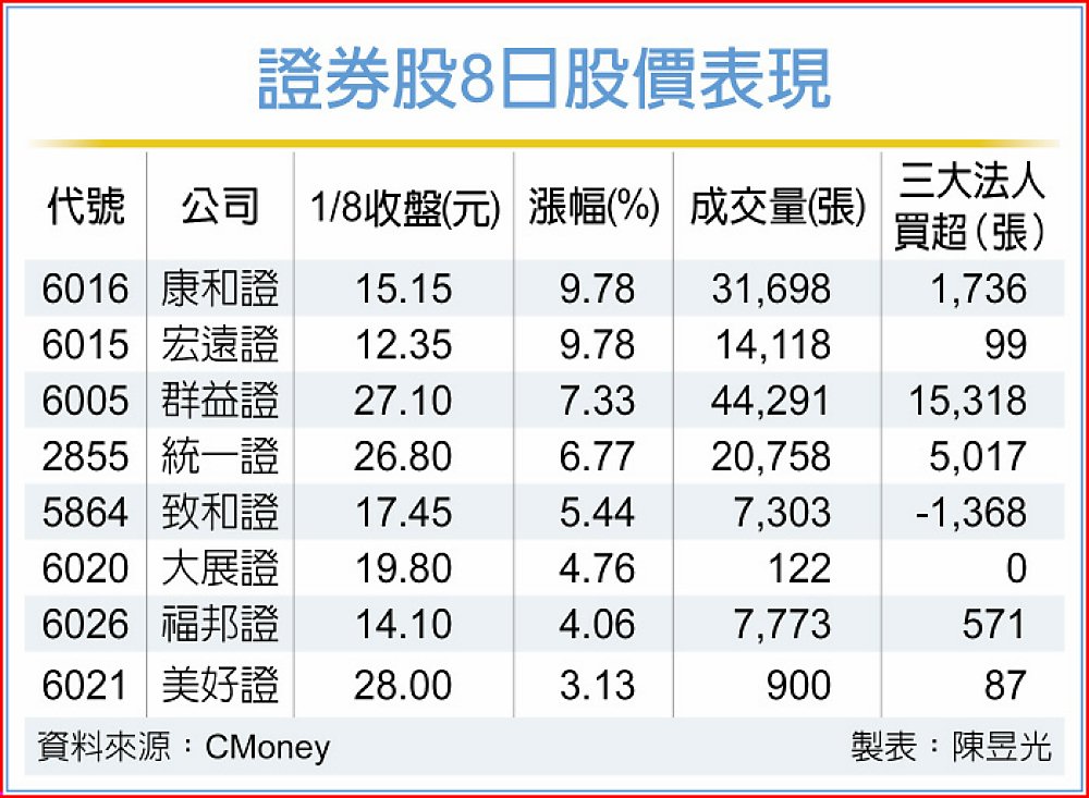 此外,券商市占龍頭元大證券2025年自結每股稅後純益(EPS)達3.7元,超越2024年的3.21元;群益金鼎證也公布2025年自結EPS達2.64元,優於2024年的2.25元,獲利動能顯著成長,市場歸功於其多元化推廣、行銷策略奏效。8日股價上漲7.33%。