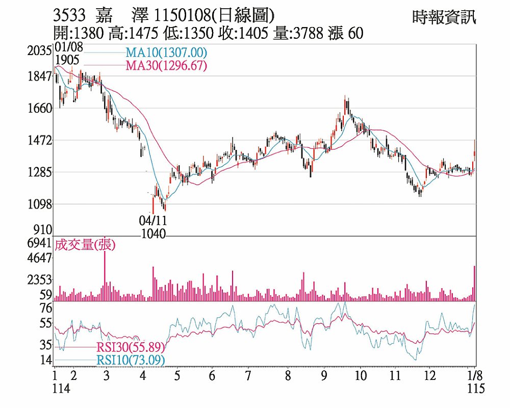 嘉澤(3533)力抗高價股輪跌,在特定買盤介入下,8日盤中一度觸及1,475元漲停價位,收盤1,405元,創2025年11月7日以來新高,累計自2026年開年以來,波段漲幅已達8.49%。