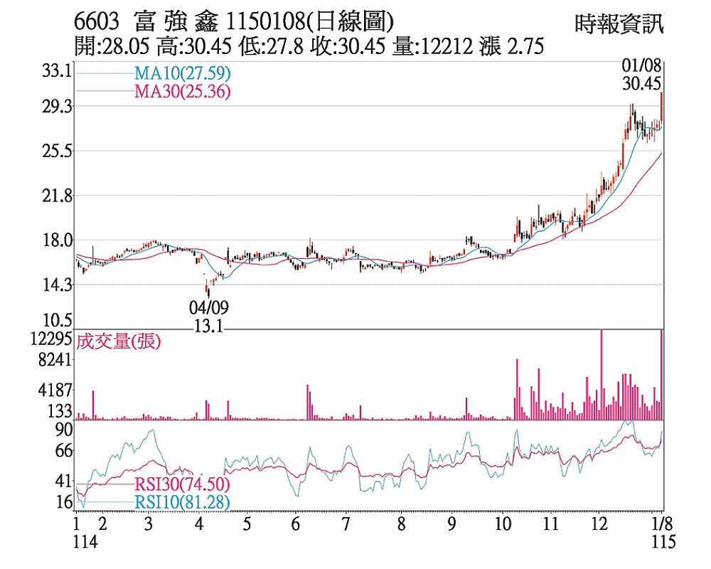 富強鑫(6603)來自汽車零組件、半導體及運動鞋等產業訂單續增,訂單能見度看到2026年第三季,全年營運展望佳,基本面利多吸引外資連四交易日敲進,8日與自營商合計買超940張助攻下,於收盤前1小時亮燈漲停30.45元,並鎖死至終場,上漲2.75元收盤,創波段新高。