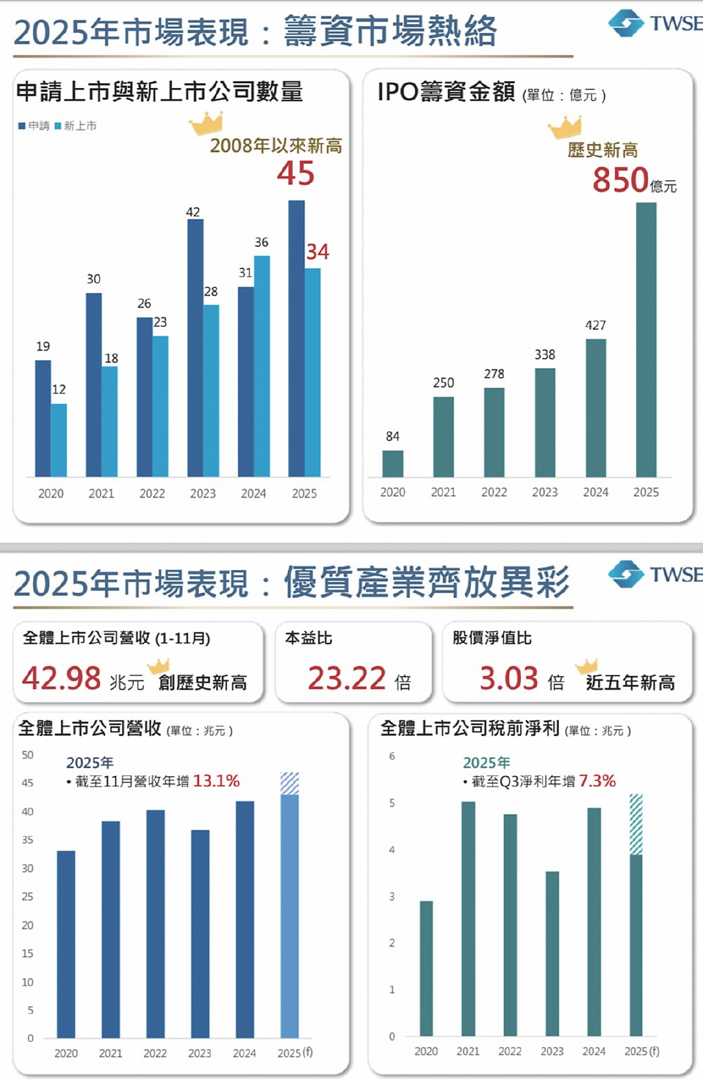 臺灣證券交易所統計,2025年申請股票初次公開募股(IPO)家數有45家,刷2008年來新高,IPO掛牌上市家數34家,全年IPO金額達850億元歷年新高,且較2024年翻倍;另定期定額投資金額衝上2,030億元新高、年增約25%。