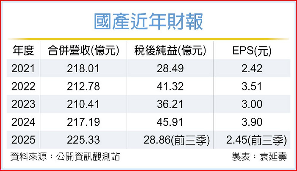 預拌混凝土龍頭廠國產建材(2504),受惠國內AI產業帶動科技廠辦工程建案增加,手中需求高磅數、高端且平均單價高的廠辦工程訂單成長,推升2025年12月營收達20.79億元、年增1.05%,全年營收225.33億元創新高,年增3.75%。