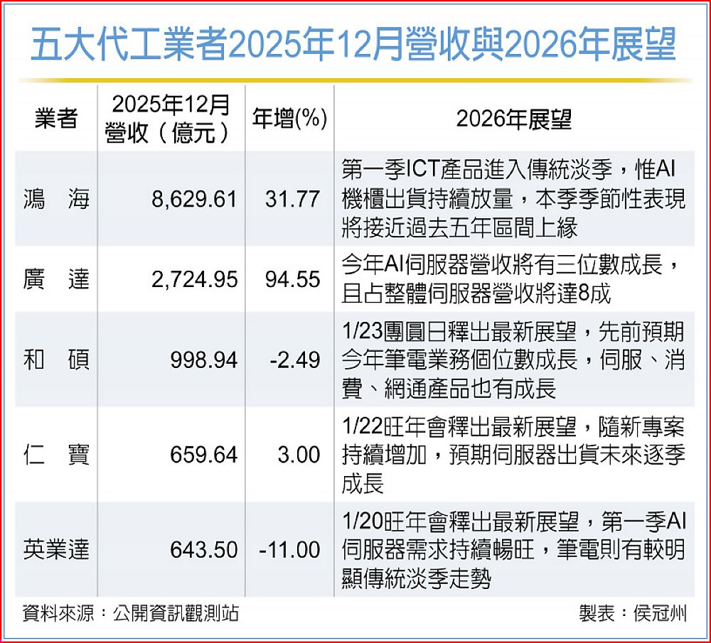 五大代工廠近日完成2025年12月營收公布,其中,和碩12月營收雖較上月些微下滑,但全年營收仍站上兆元關卡,仁寶繳出年、月雙增表現,英業達則在筆電出貨動能優於預期及AI伺服器業務持穩下營收回溫、寫歷年同期次高。