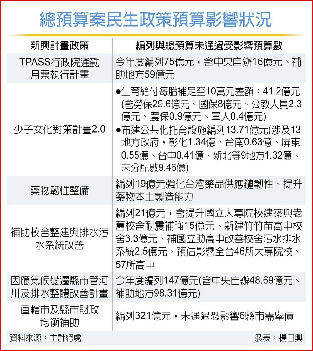 朝野對立導致今年度總預算案至今難產,如今僵局看似出現解決曙光。在野黨團9日預計將具有急迫性及攸關重大民生新興資本支出及新增計畫,由立院逕行議決並付委審查,含TPASS、生育給付等,預計藍白、在野與地方首長下周將再有討論。