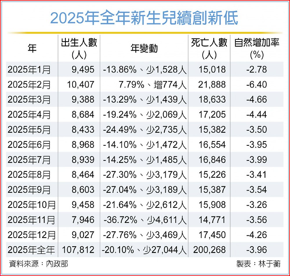 內政部發布最新人口統計,2025年12月出生僅9,027人、年減逾27.76%,12月死亡人數逾1.7萬人,連續60個月「生不如死」,統計2025年全年共有10.7萬名新生兒續創新低,年減超過20%、比去年少了超過2.7萬人。此外,2025年底全國總人口已連續24月下跌,降至2,329萬人,其中,65歲以上人口達467.3萬人、占比20.06%,已正式邁入「超高齡社會」。