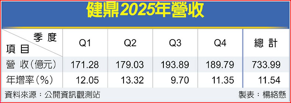 PCB全製程廠健鼎(3044)公告2025年營收表現,全年合併營收達733.99億元,年增11.54%,創歷年新高紀錄,優於市場預期,公司表示,年底前雖受部分應用進入調整期影響,但第四季仍創同期新高。展望2026年,健鼎營運重新朝高階伺服器、記憶體與車用板件等毛利結構較佳應用,持續受惠DDR5/DDR4的需求飆升,法人看好營收及獲利可望續寫新猷。