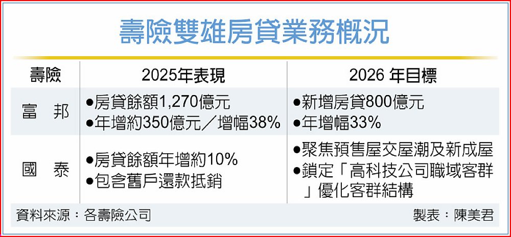 展望2026年,房貸業務仍是兩家壽險的經營重點。富邦人壽表示,因應ICS新制接軌,將持續提升台幣資產配置,房貸在風險資本與收益考量下具吸引力,今年目標為新增房貸800億元、年增33%。