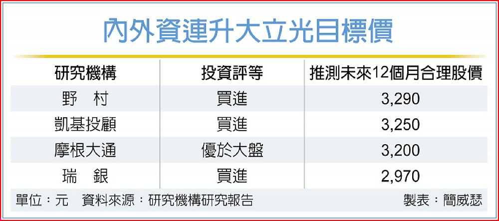 光學股王大立光法說會後,瑞銀、野村、摩根大通證券與凱基投顧攜手調高股價預期,多頭共識超越3,200元,搭配大立光公司持續實施庫藏股的利多發消,激勵大立光股價9日開低走高,終場上漲2.22%、收2,530元,市場看昔日股王前景的期待感持續升溫。