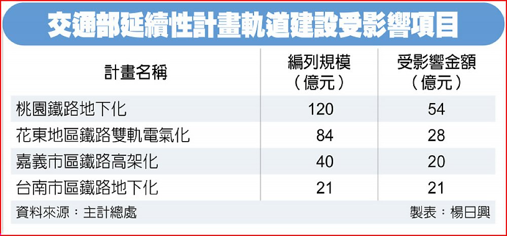交通部盤點,延續性計畫受影響的248億元當中,衝擊最大的主要鐵道建設包含桃園地下化、花東雙軌電氣化、嘉市高架化、台南地下化,當中桃園項目編列120億元、影響數額高達54億元,台南項目編列21億元均受影響,四案受影響總數約123億元。