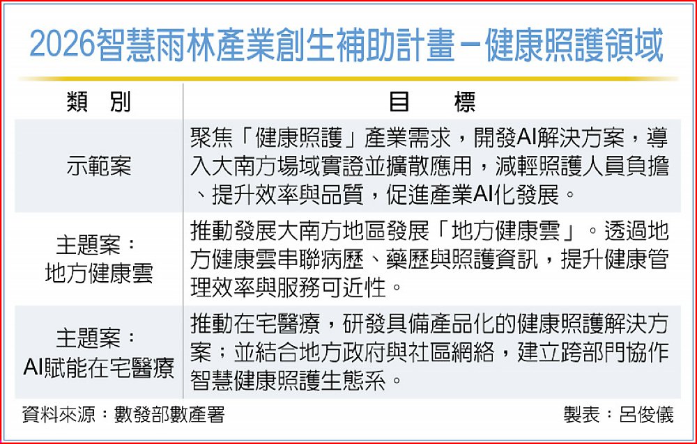 而數發部智慧雨林,數產署表示,115年度持續深耕數位轉型與AI技術應用於「健康照護產業」,針對需求端痛點提出AI解決方案,強化AI於健康照護場域導入與落地。推動模式以「場域出題+AI技術導入+人才共育」三方協作,由資通訊服務業者提供AI技術解方,大專校院媒合師生團隊進行技術加值與實地驗證。