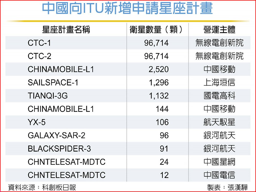 綜合陸媒報導,依ITU官網資訊顯示,中國在2025年12月最後一周提交多個衛星星座申請案,涵蓋中國星網、上海垣信、中國移動、中國電信、無線電創新院、國電高科、航太馭星、銀河航太等多家公司機構。