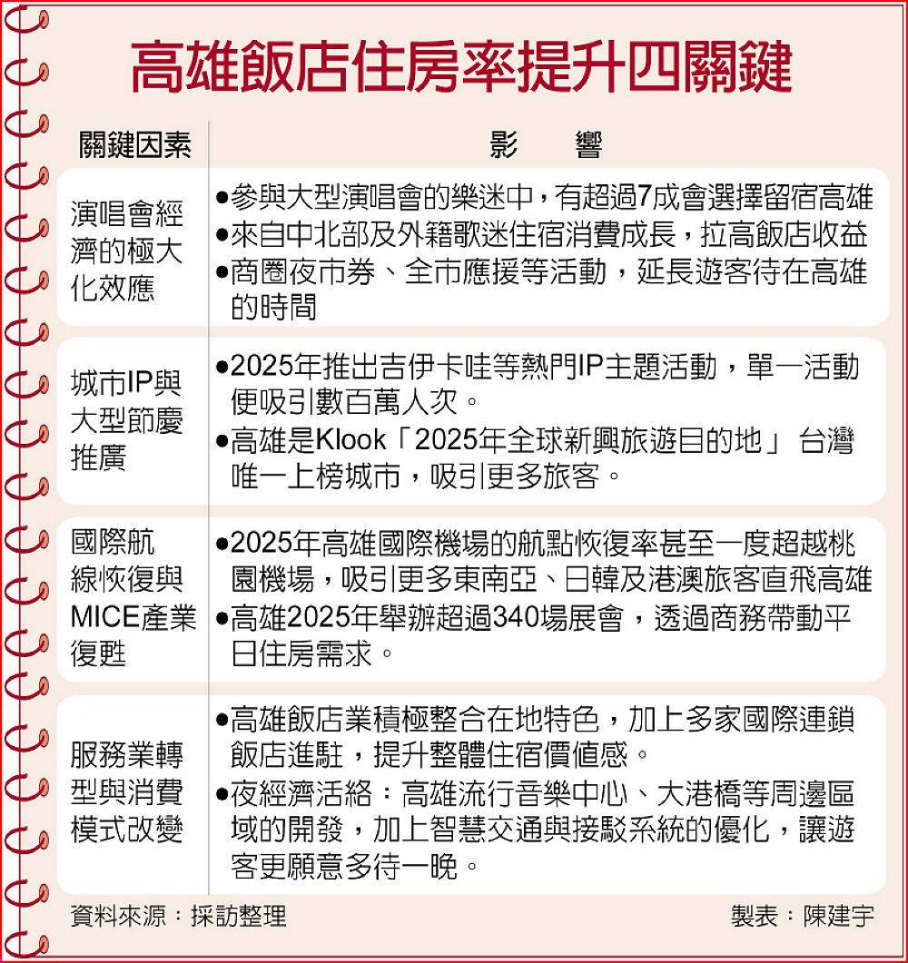 高雄演唱會經濟發威,旅宿業成大贏家,據統計,2025年高雄飯店業平均住房率超過75%、年增約10%。專家分析,除演唱會經濟,城市IP與大型節慶推廣、國際航線恢復與MICE會展產業復甦、服務業轉型與消費模式改變,都是住房率提升的關鍵。