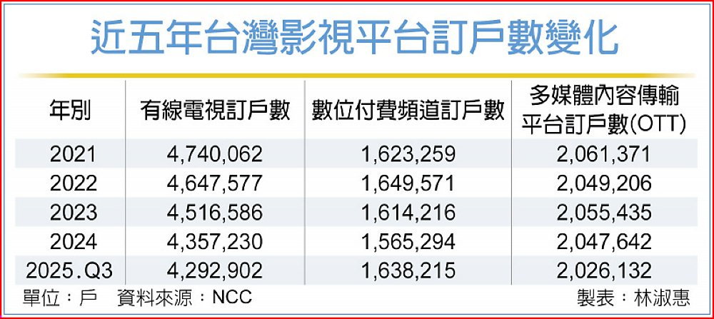 NCC最新統計指出,截至2025年第3季,國內有線電視訂戶數與數位機上盒訂戶數相同皆為429.3萬戶,家戶普及率為43.64%。數位付費頻道訂戶則為163.8萬戶,僅占全國總戶數之 16.7%。有線電視訂戶數已連續八年下滑。但訂閱數位付費頻道的用戶數則逐年成長,自2014年僅121萬訂戶,2022年達到高峰165萬,但2024年下降至156.5萬戶,2025年第三季再成長至163.8萬戶、普及率16.65%。