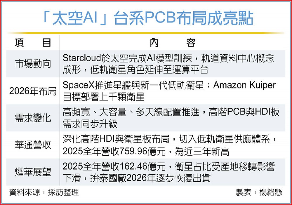 輝達(NVIDIA)支持新創Starcloud近期成功利用H100晶片於太空中完成AI模型訓練,象徵「軌道資料中心」概念跨出關鍵一步,「太空AI」應用開始浮現輪廓。隨AI運算逐步突破地面電力與基礎設施限制,低軌衛星正由通訊節點延伸至運算與資料處理平台,市場關注切入低軌衛星關鍵板件台系PCB廠,包括華通(2313)、燿華(2367),後續營運能見度備受矚目。