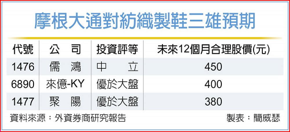 台股最近吹起股價低檔翻揚風,摩根大通證券此時將注意力對準紡織製鞋指標股,不僅將聚陽(1477)、儒鴻(1476)及來億-KY(6890)股價預期全往上調,更把聚陽投資評等從「劣於大盤」跳升「優於大盤」,推測合理股價大舉升至380元。