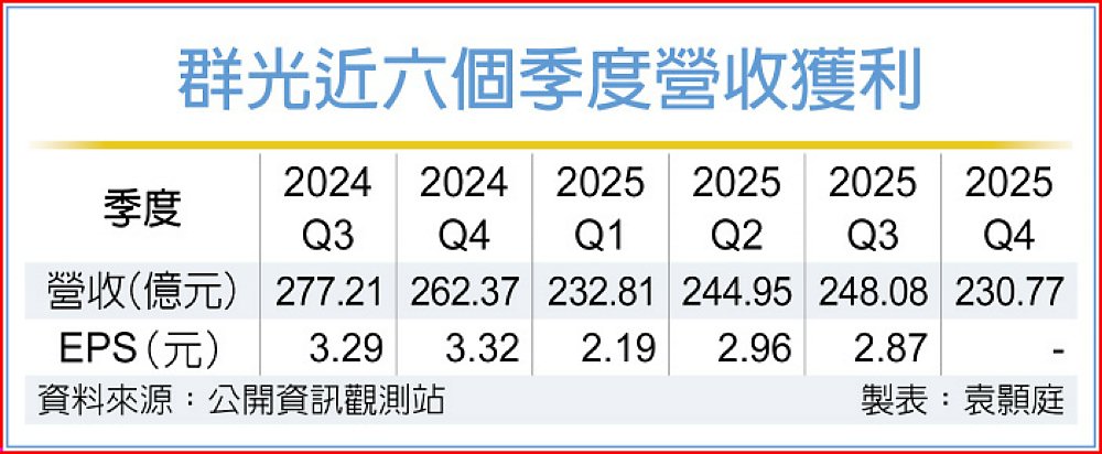 群光2025年合併營收956.60億元,年減5.7%。展望2026年,法人預期,群光旗下鍵盤、影像、電源三大事業都將有高個位數的成長,全年合併營收可望重返千億元大關。