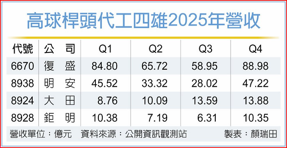 受惠高爾夫擊球人口增加、產業復甦,高球桿頭代工四雄2025年業績亮眼,復盛(6670)、明安(8938)、鉅明(8928)2025年營收,分別繳出歷史次高、第三高和歷史最高的佳績;大田(8924)也擺脫美國關稅桎梏,2025年營收「季季高」,且因越南新廠將投產,樂觀2026年會更好。