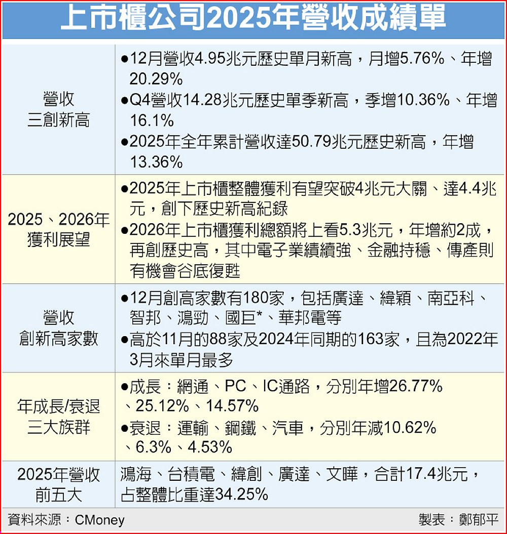統計上市櫃公司2025年12月營收4.95兆元創歷史單月新高,月增5.76%、年增20.29%;第四季營收14.28兆元為歷史單季新高,季增10.36%、年增16.1%;2025年全年累計營收50.79兆元也寫歷史新高,年增13.36%。富邦投顧董事長陳奕光推估,前三季獲利逾3兆元,預計第四季將再貢獻逾1兆元,帶動2025年上市櫃整體獲利突破4兆元、達4.4兆元的新高紀錄。