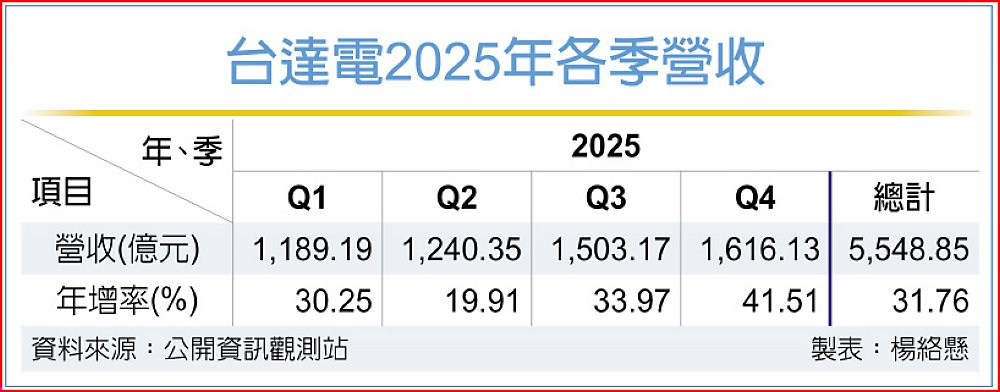 電源廠台達電公告2025年營收表現,全年合併營收5,548.85億元,年增31.76%,再創史上新高;其中,12月營收536.86億元,月增6.22%、年增38.59%,為單月第三高水準,推升第四季營收達1,616.13億元,季增7.51%、年增41.51%,連續六季改寫高點,營運動能延續至2026年。