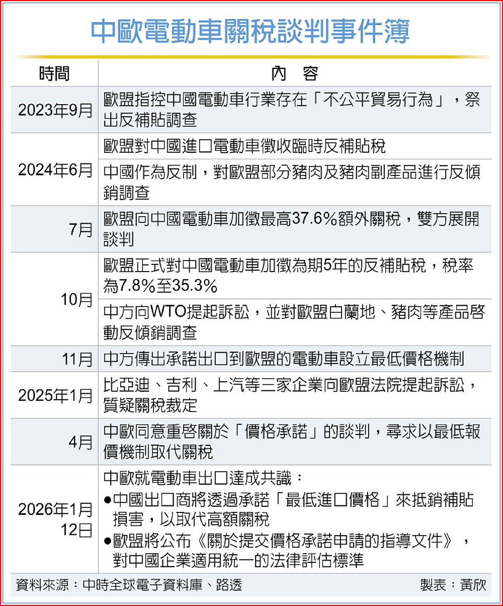 2024年10月,歐盟成員國表決通過對中國電動車加徵35.3%關稅,並於同年10月31日生效。11月,歐盟派員赴北京開展新一輪談判,討論以最低價格機制替代關稅可行性,但未達成具體結果。