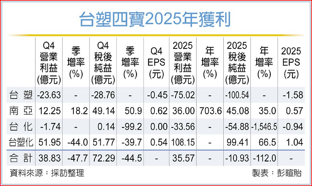 受惠煉油價差放大、電子材料行情活絡,台塑化、南亞2025年獲利告捷報喜,台塑化2025年第四季稅後純益51.77億元、每股稅後純益(EPS)0.54元,全年稅後純益99.41億元、年增66.5%,EPS達1.04元,獲利居台塑四寶之冠。
