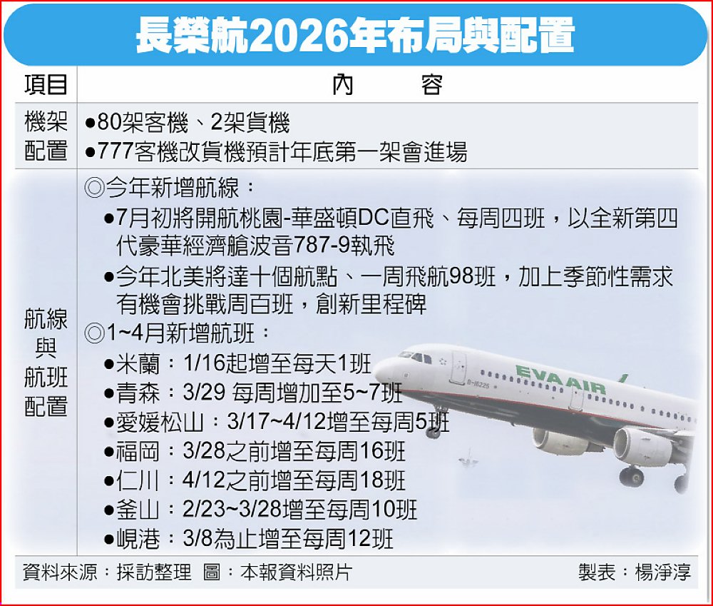 客運方面,2026年首季需求比過去還高,且訂位狀況超乎預期,2026年1月起將陸續加開米蘭、青森、愛媛松山、福岡、仁川、釜山及峴港等熱門旅遊區域航班;展望全年,整體客運平均票價差異不大,雖然競爭仍然激烈,不過長榮航在高端旅客的比例較高,商務艙與豪華經濟艙的訂位狀況優於經濟艙,加上華盛頓D.C.開航,將有助于推升整體客運收入。