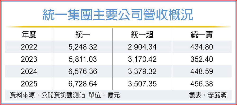 統一集團最大本柱統一超商,2025全年合併營收首度突破3,500億元至3,507.35億元,年增3.79%,再創新猷。結合集團多元生活品牌創造綜效,統一超2025年12月合併營收305.17億元、年增4.71%,再創同期新高紀錄,轉投資事業包括菲律賓7-ELEVEN、統一生活(康是美)、悠旅生活(星巴克)、統一資訊、統一百華同步成長,持續挹注整體營收表現。