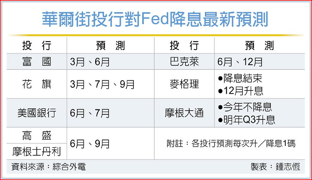 像原本預測今年降息3次的花旗,已把Fed降息時間從原先1月、3月和9月,延至3月、7月和9月。摩根士丹利先前預料Fed分別在1月和4月降息,但如今也延後至6月和9月。